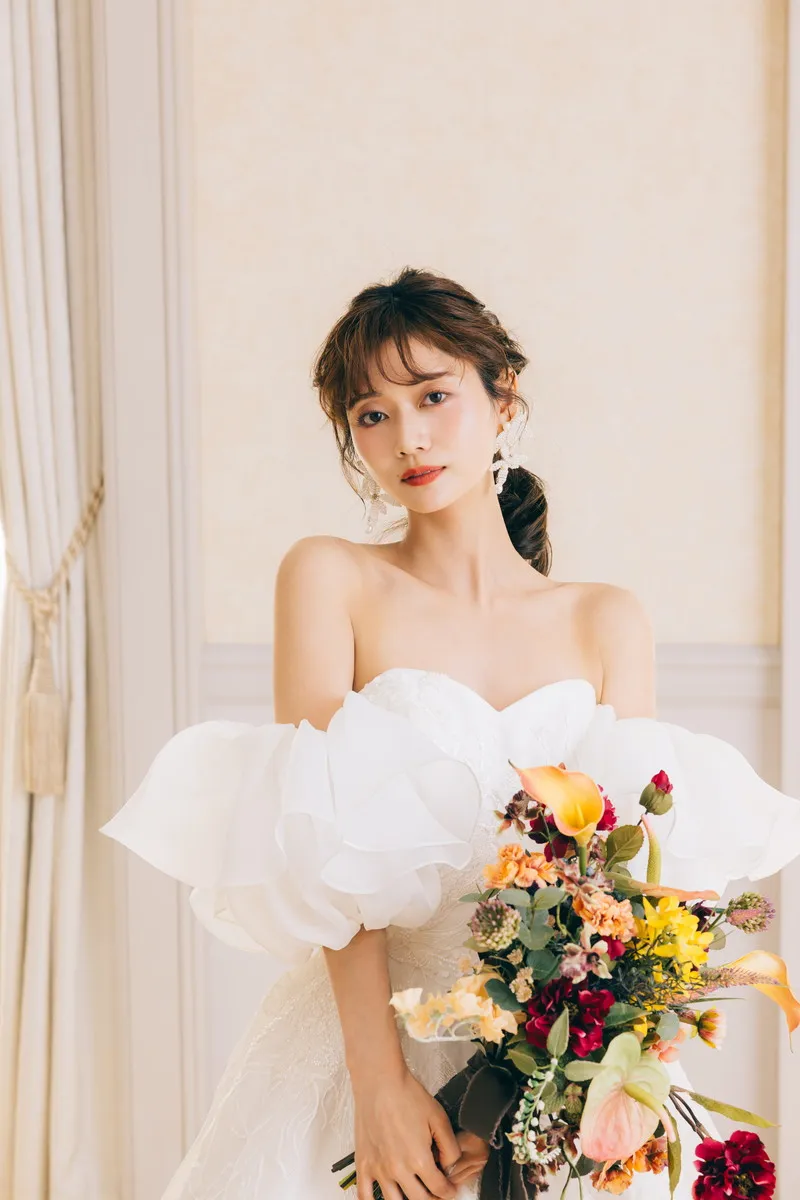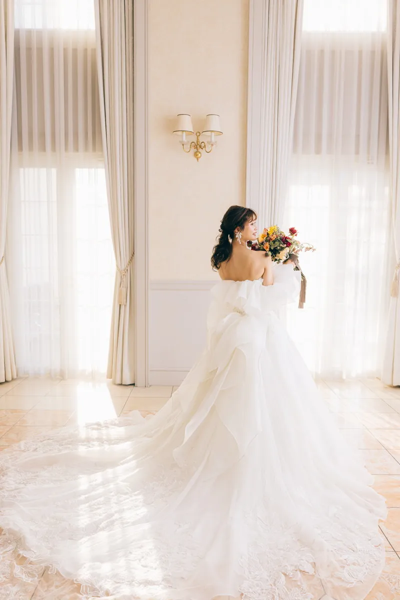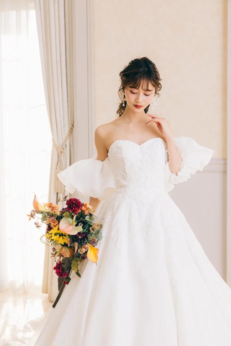 | 付属の アレンジ小物 | オフショルダー 2428 OW / パフスリーブ 2428 OW / 後ろフリル 2428 OW / トレーン 2428 OW |